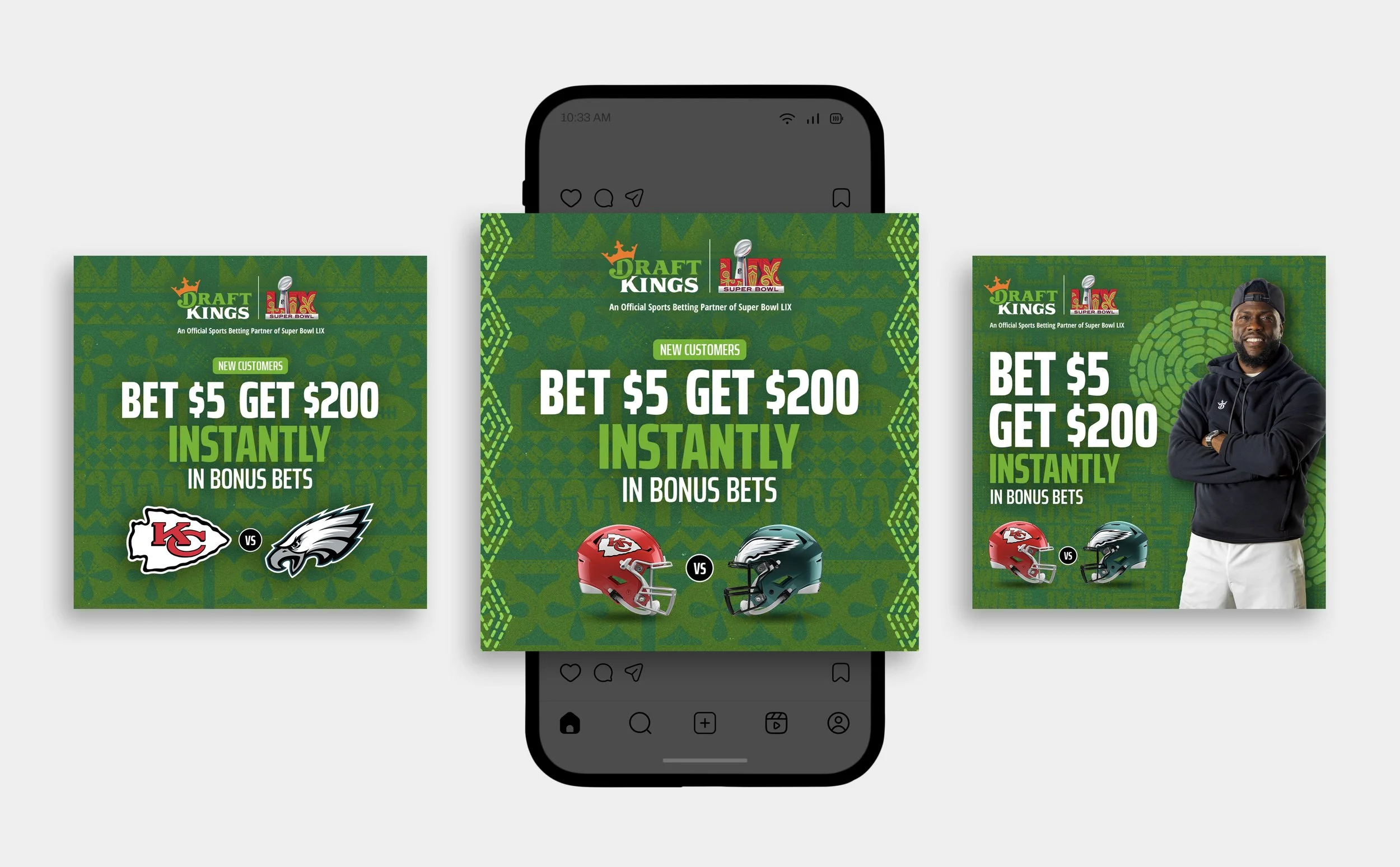 For Super Bowl LIX in 2025, DraftKings featured a prominent, in-house produced campaign centered on a "Bet $5, Get $200" promotion for new customers. The ads, which ran around the Feb. 9, 2025, game at Caesars Superdome, featured appearances by comedian Kevin Hart, LeBron James, and former NFL coach Jim Mora.